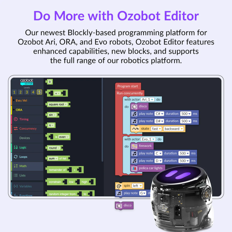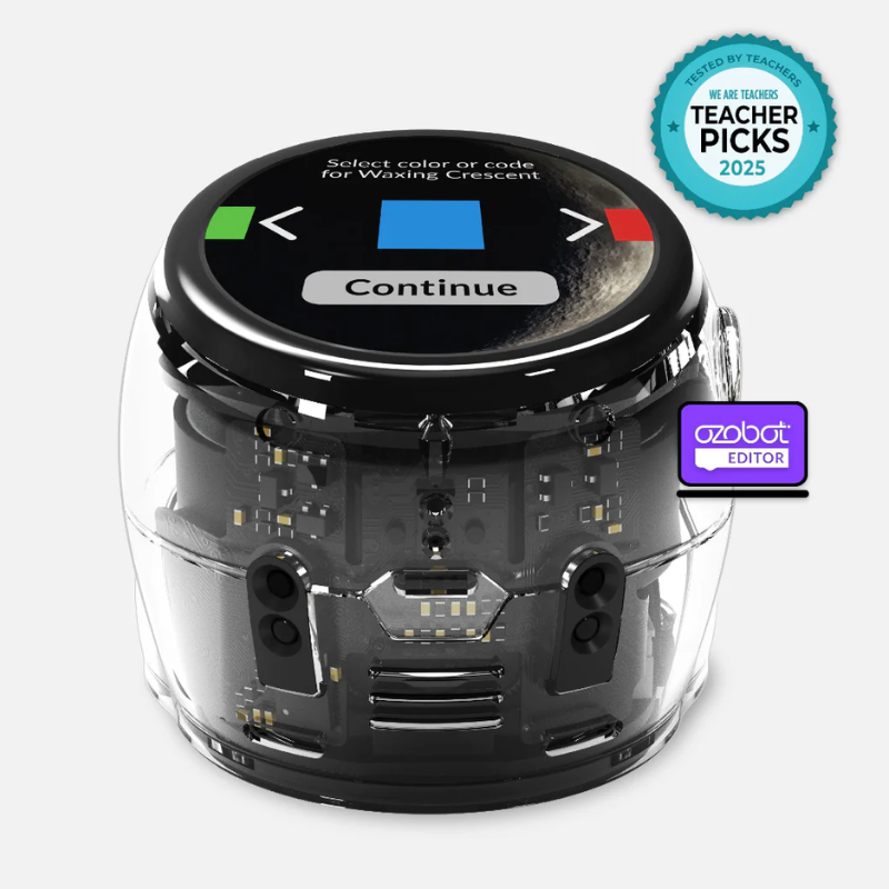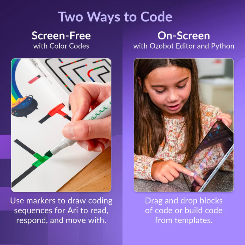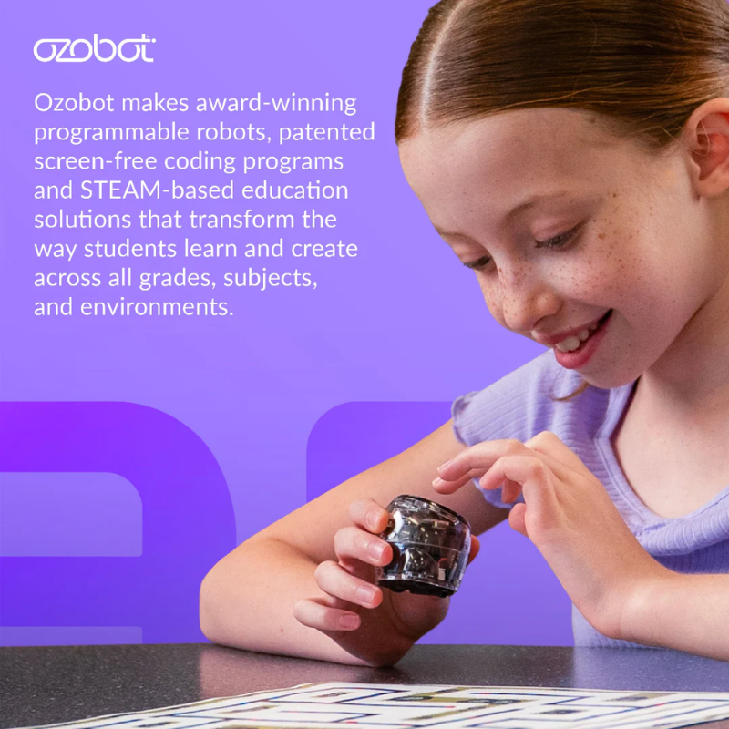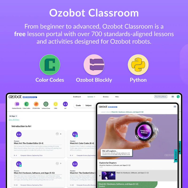 Ari is a compact robot powered by Android that uses its high-resolution interactive display to teach computer science and core content to K12 students. Through an ecosystem of engaging apps, users can experience ready-to-run, standards-aligned lesson content and immersive activities across STEM, computer science, and core subjects. Students can program Ari three ways: with Ozobot Color Codes, Ozobot Blockly, and Python.