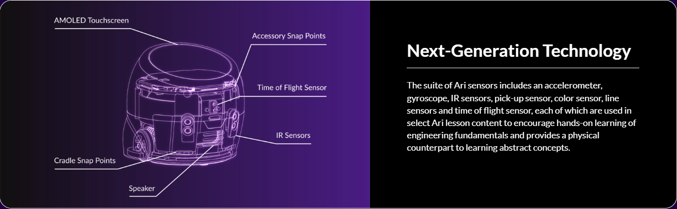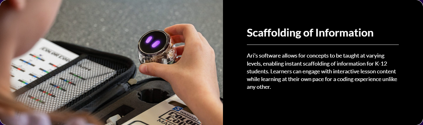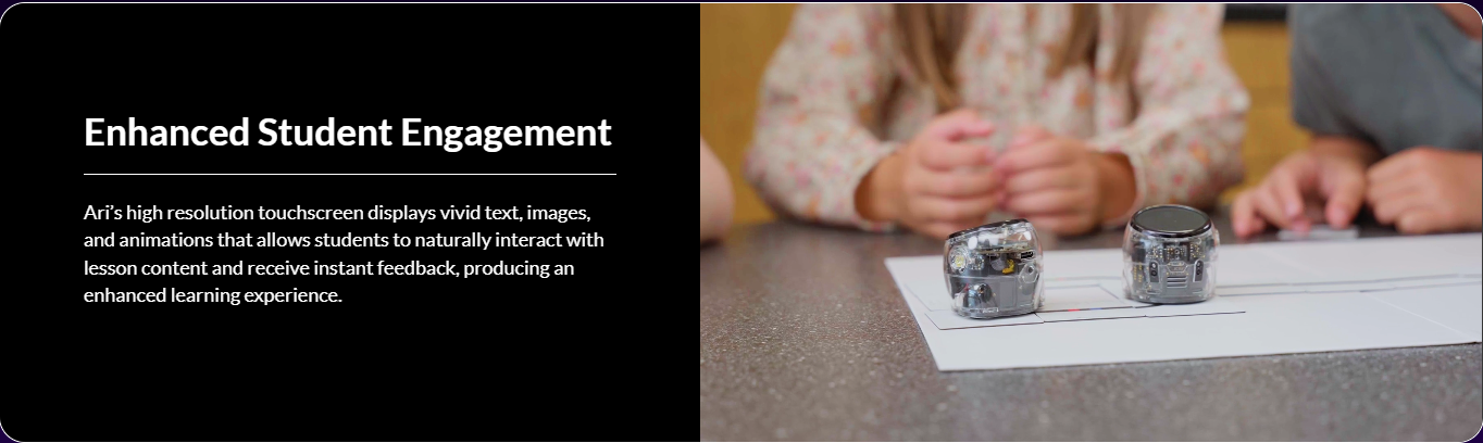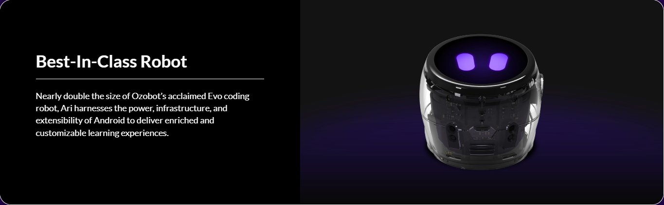 Ari is a compact robot powered by Android that uses its high-resolution interactive display to teach computer science and core content to K12 students. Through an ecosystem of engaging apps, users can experience ready-to-run, standards-aligned lesson content and immersive activities across STEM, computer science, and core subjects. Students can program Ari three ways: with Ozobot Color Codes, Ozobot Blockly, and Python.