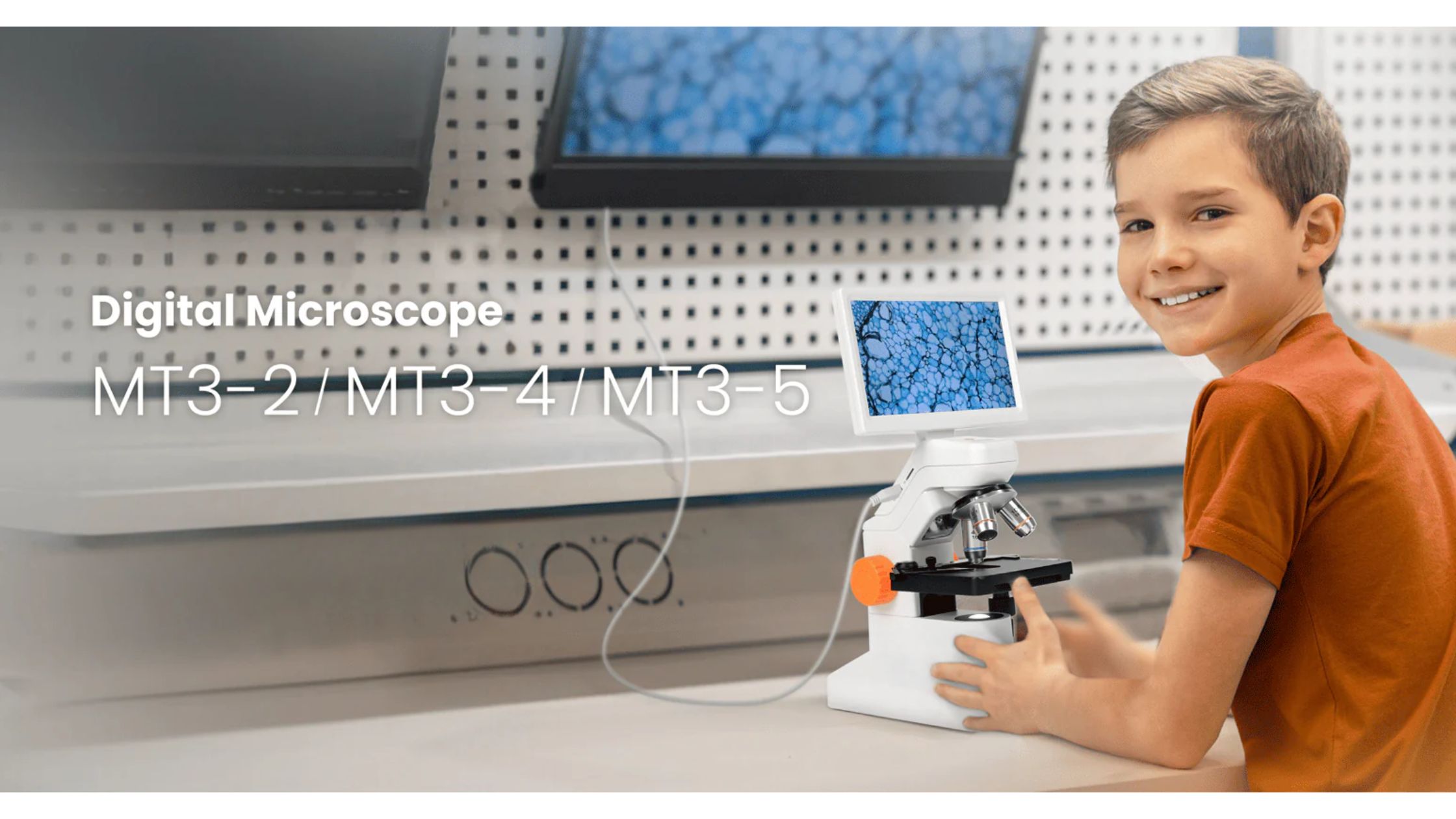3/4-Objective Lenses Switching: Switch seamlessly between 4X, 10X, and 40X objectives, offering optical total magnification of 40X, 100X, and 400X, ideal for a high magnification microscope. Combined with 7-inch screen, the digital Magnification is up 400x-1600X. The MT3-5 equipped with 4 objective lenses etween 4X, 10X, 40X and 60X.