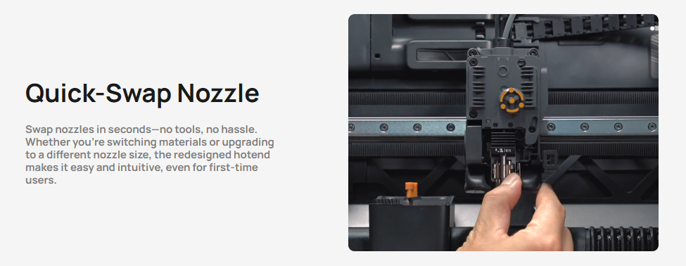 Quick-Swap Nozzle Design: Change the hotend assembly in ~30 seconds using a one-clip mechanism—no wiring or disassembly.