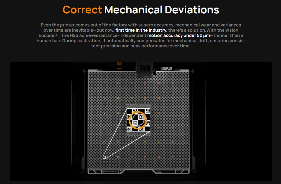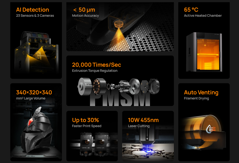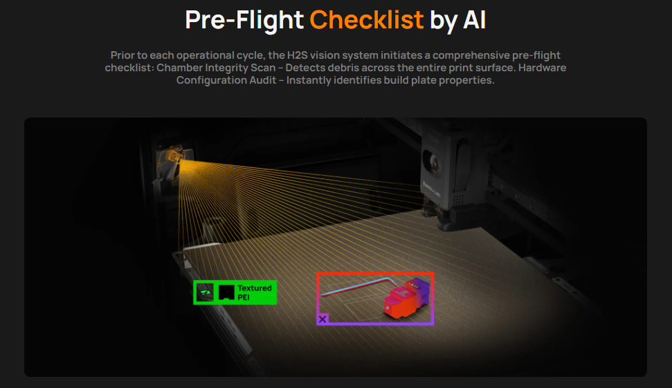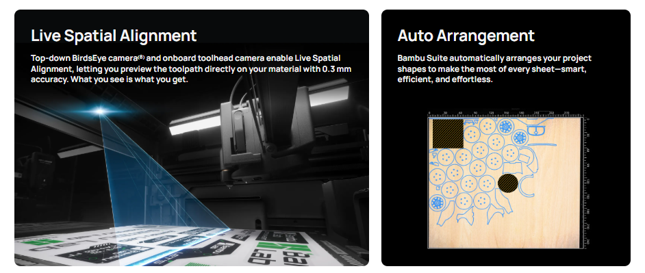 • With AI-driven real time monitoring, the vision system detects clumping, spaghetti and purge chute jamming as they happen, helping prevent failed prints before they start. This same vision system powers advanced features like Live Spatial Alignment, allowing precise laser and cutting calibration, and Vision Encoder technology, which enhances positional accuracy.