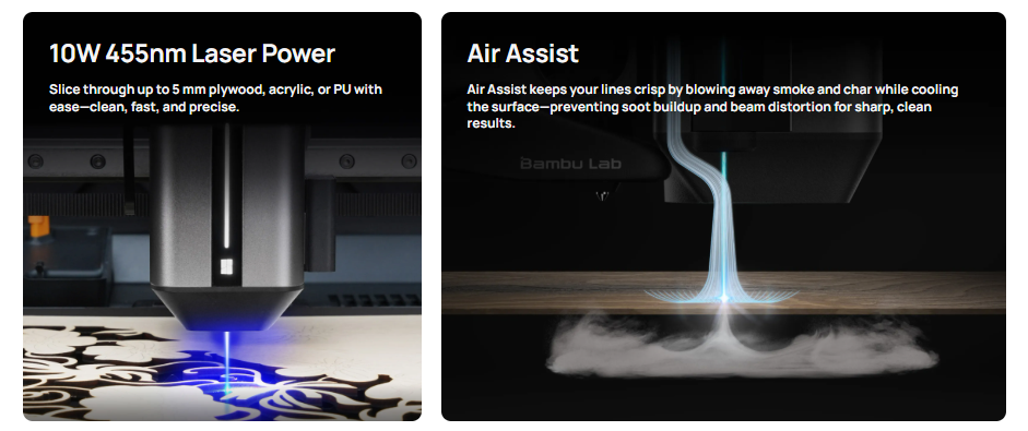 • Air Assist & Safety Features: An air assist system improves surface quality by cooling the laser path, ensuring cleaner and more precise results. The printer also includes laser safety windows and an emergency stop button for enhanced user safety