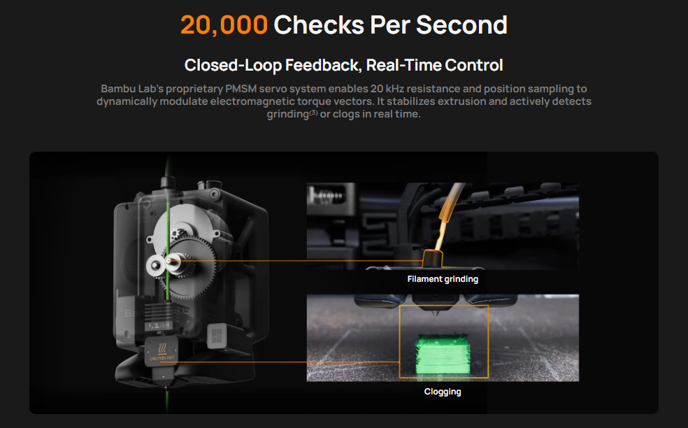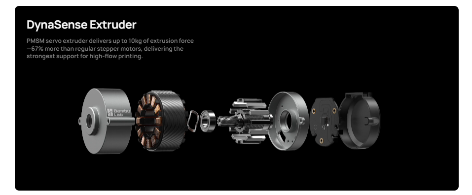 PMSM Servo Extruder: Outputs up to 8.5 kg of extrusion force (≈70% more than previous models), enabling consistent flow and stability even under demanding print conditions.
