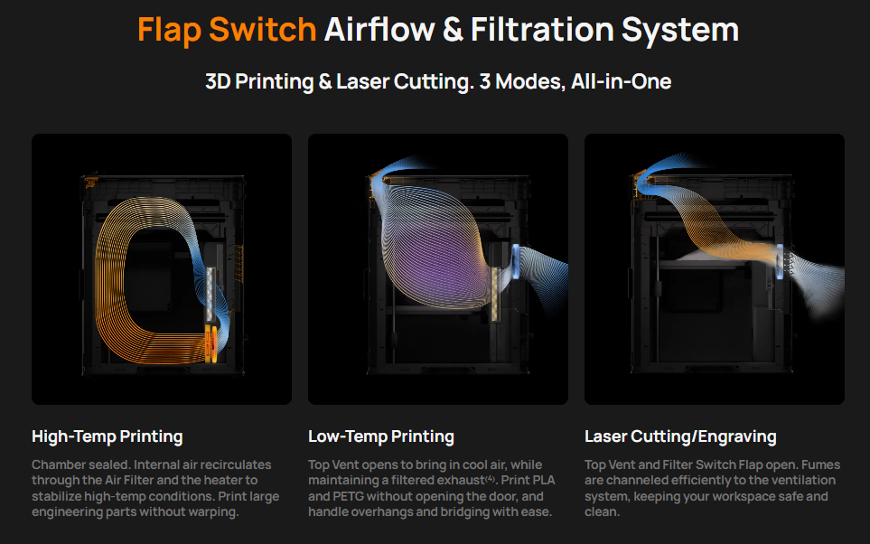Adaptive Airflow Cooling System: Draws in cool air directly (not recirculated), improving overhangs and cooling control even with the printer chamber closed.