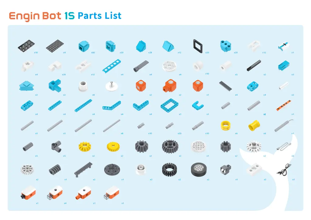 The WhalesBot EnginBot 1S includes 11 types of gears, totaling 19 pieces, ensuring smooth and efficient mechanical movement in your robot’s drivetrain. These gears are designed to work together seamlessly for optimal performance.