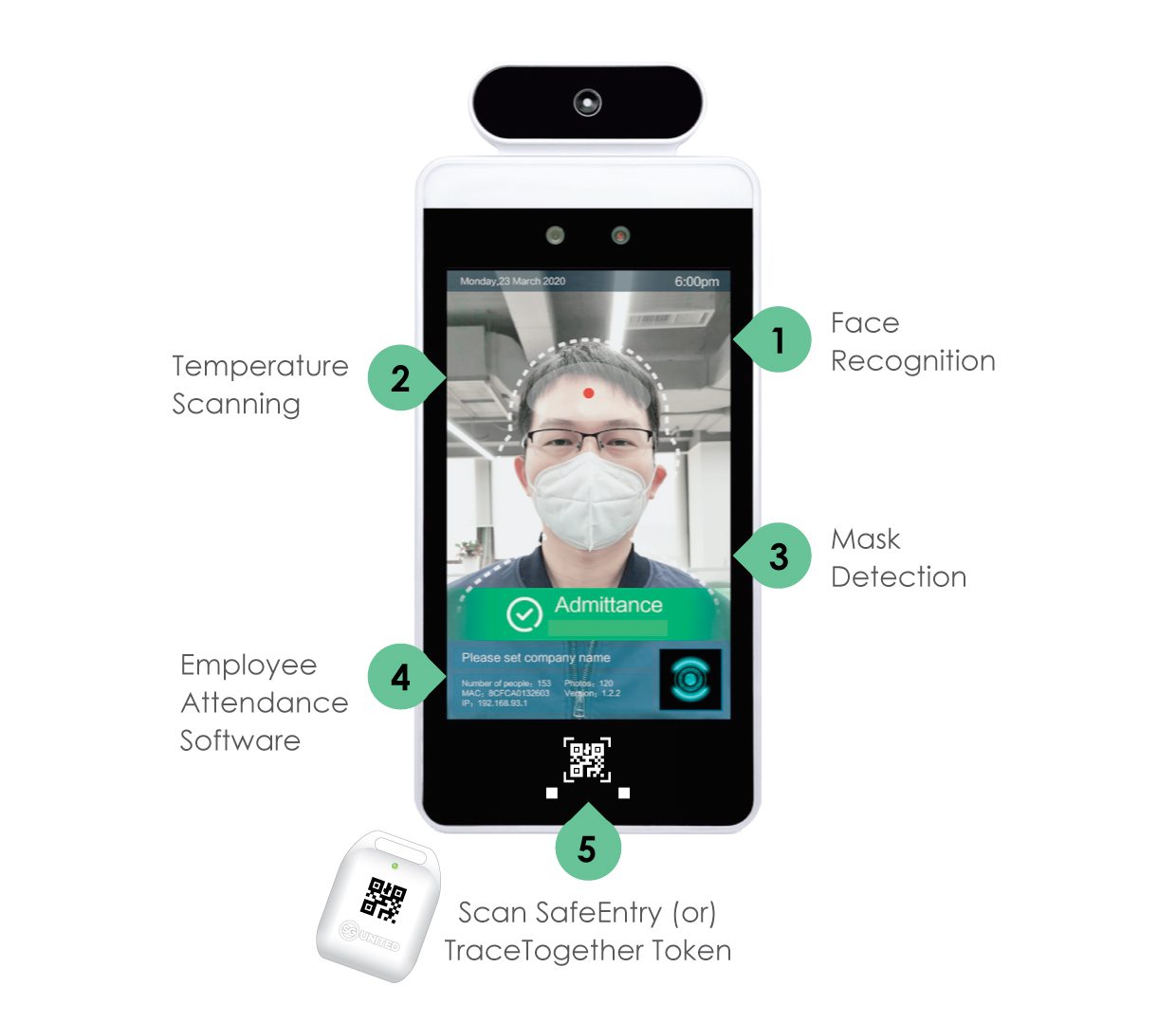 – The device’s IR Temperature Scanning result is only for attendance indication record purpose only, not to be used for any form of medical diagnostic purpose and etc.